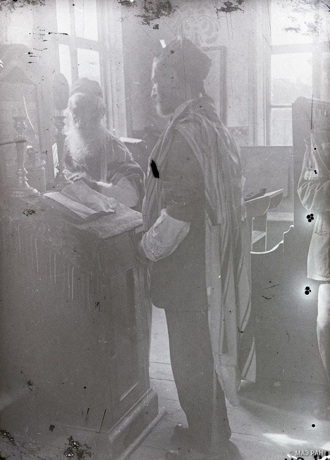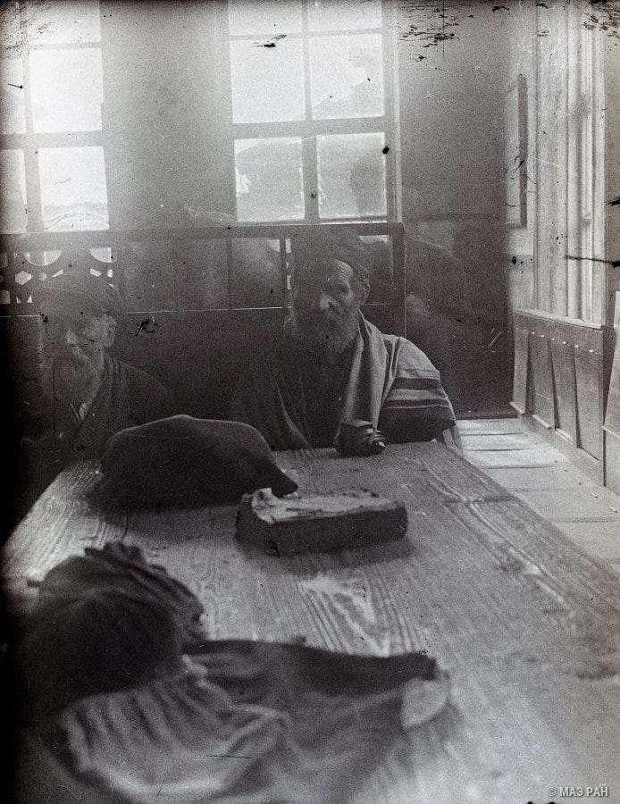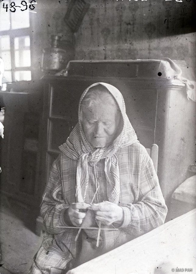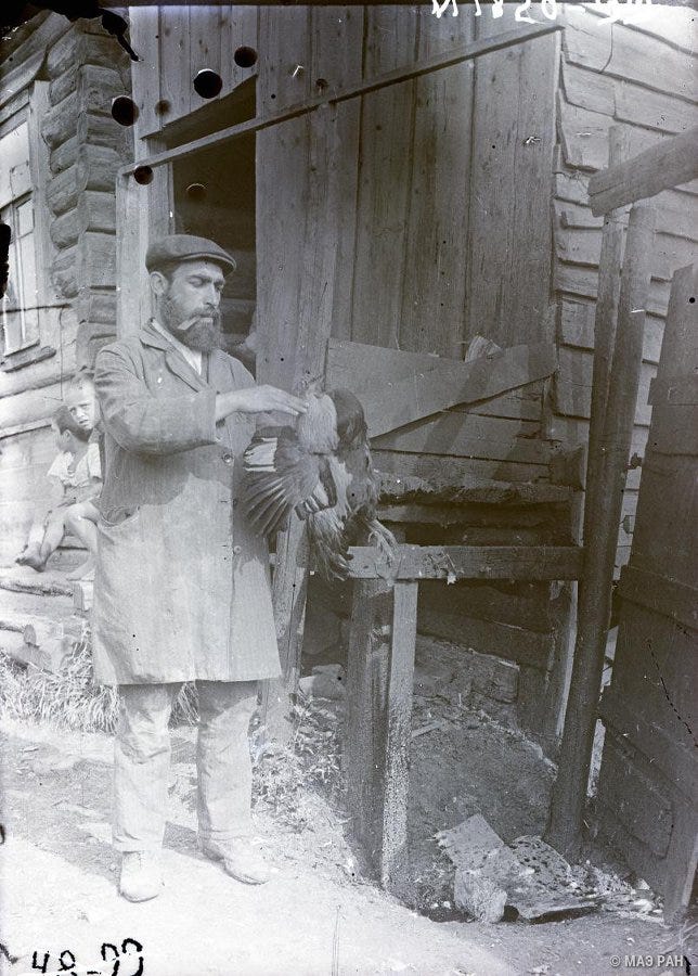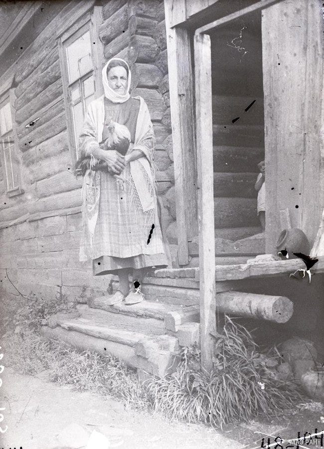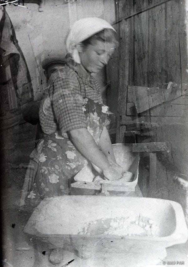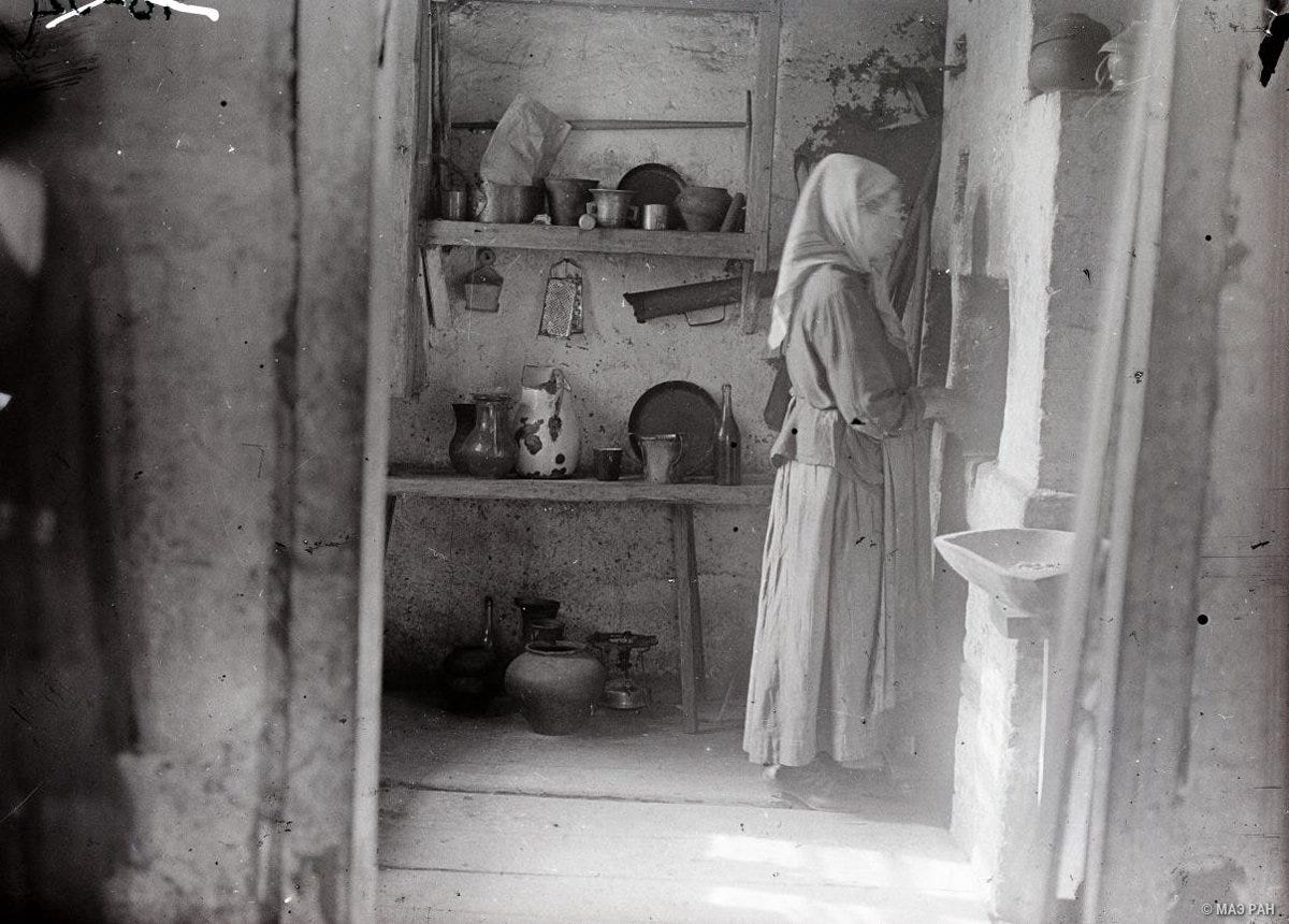 During digitizing, many photographs and names were misidentified. The above photo is listed as “Wife of Shoychet Revzin getting ready for Shabbos.” She is wearing a different dress than the wife of Shoychet Revzin and a different tichel. Although there is a distinct and beautiful bowl plate carved out of wood that appears in both pictures. The wooden, carved bowl is to the right of both women. Maybe she is a relative, a sister in the midst of the same Shabbbos prep?