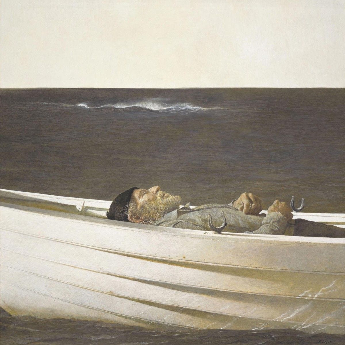 I dream of dreaming in that boat, asleep or maybe dead. Wyeth died in 2009.